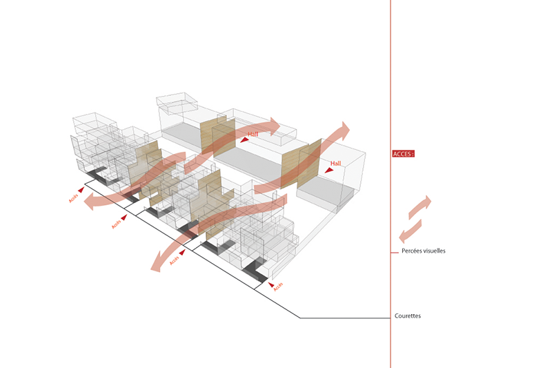- d'un bâtiment de logements collectifs au Sud, desservis par deux halls ouverts sur la hauteur du bâtiment et faisant office de failles permettant les respirations à l’intérieur de l’îlot.