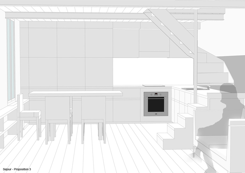D'autre part, en partie basse c'est la fin d'un plan de travail qui permet l'assise de l'escalier.